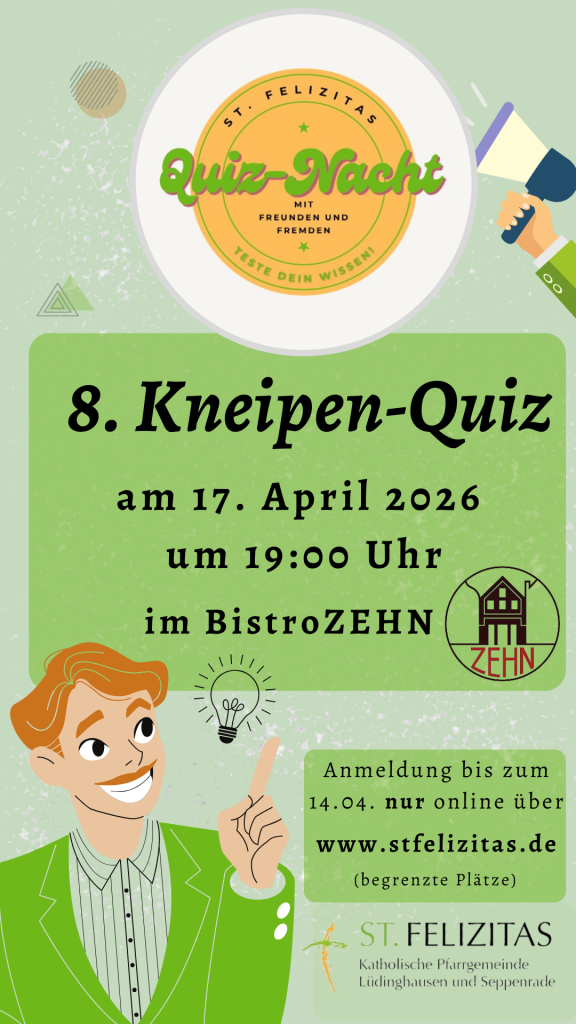 Dazu lädt der Pfarreirat wieder ins Bistro Zehn ein, wo der achte St. Felizitas Kneipenquiz-Abend stattfinden wird.